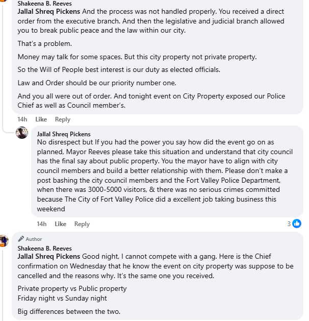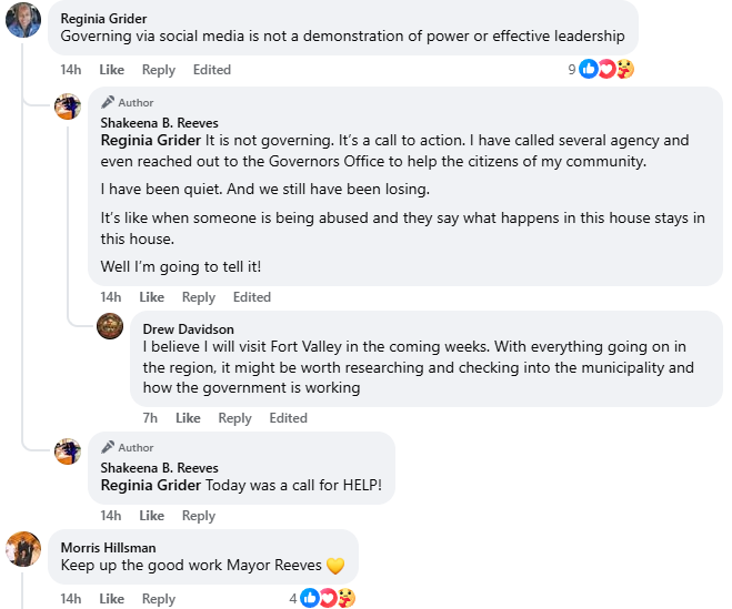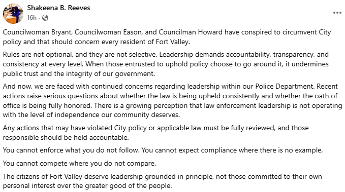 Reeves wrote that the situation “should concern every resident of Fort Valley” and called for accountability and adherence to city policy.