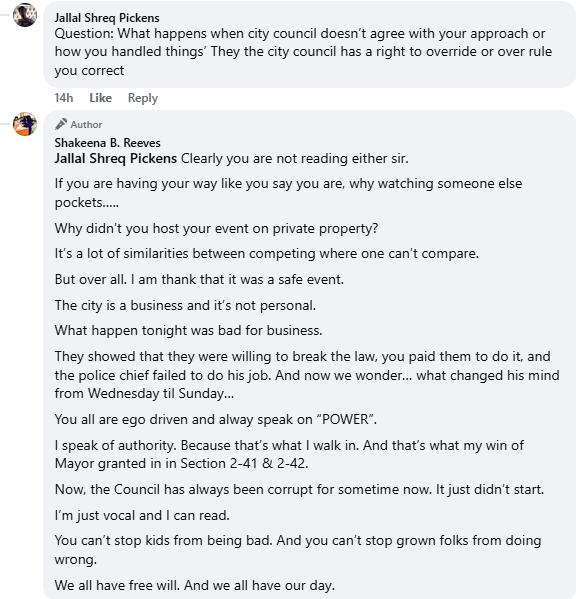 In those posts, Reeves wrote that members of the city council had “conspired to circumvent City policy” and raised concerns about whether proper procedures were followed. She also questioned leadership within the police department and whether laws were being upheld consistently.