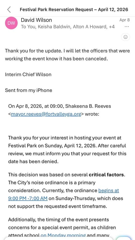 FORT VALLEY, Georgia (41NBC/WMGT)- Fort Valley Mayor Shakeena Reeves denied a request to host an event at Festival Park on April 12th, citing ordinance requirements and safety considerations, according to city emails posted on her Facebook page.