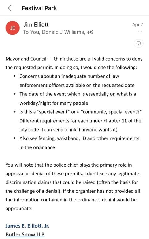 Elliott referenced issues including the number of available law enforcement officers, the classification of the event under city code, and compliance with ordinance requirements. He also wrote that the police chief plays a primary role in the approval or denial of such permits.