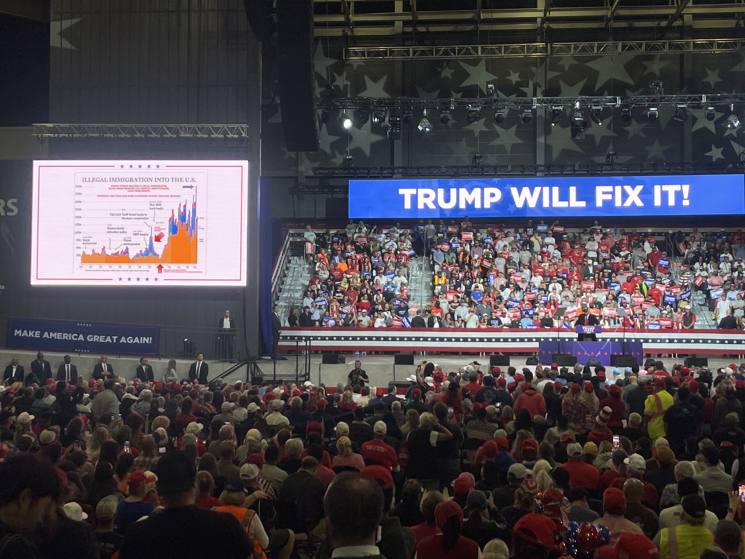 8:45 p.m. – Trump, after talking a while about immigration and having victims of alleged immigrant crimes speak to the crowd here, changes topics to the economy, mentions tax cuts: No tax on tips, no tax on overtime, no tax on social security. And mentions his line, “Drill, baby drill.”
