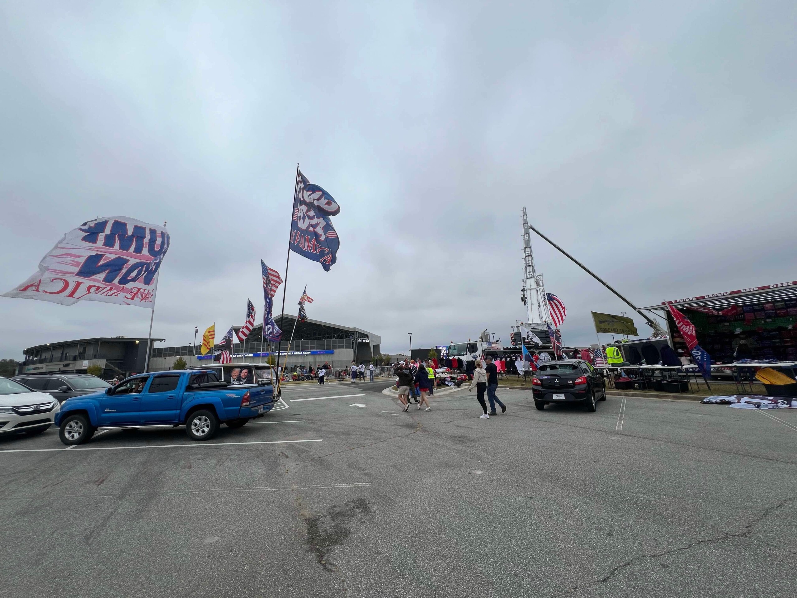 8:45 a.m. – Several dozen cars were parked outside Atrium Health Amphitheater, more than nine hours before the former president is scheduled to take the stage. Vendors are beginning to set up on Eisenhower Parkway near I-75.