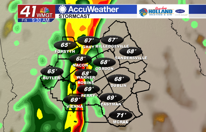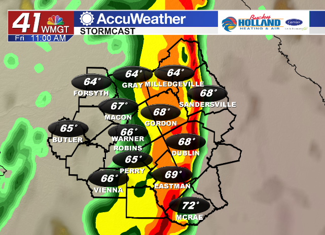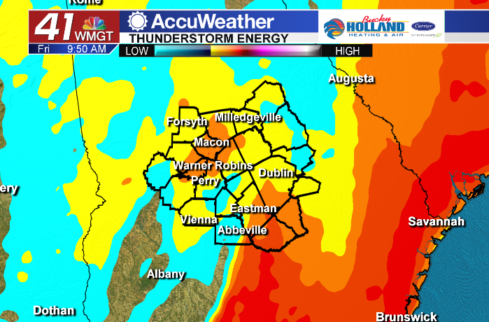 Our tornado ingredients will likely be at their highest as we move through the morning in Middle Georgia. The graphic above is the “Significant Tornado Parameter” and represents the components typical of tornado environments and you can see that increase in our eastern counties.