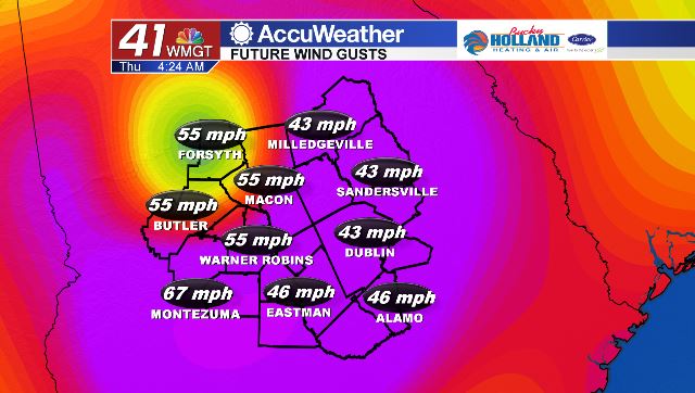 Heavy rain will give way to moist soil. High wind gusts will likely result in some trees coming down and power also being knocked out across Middle Georgia.