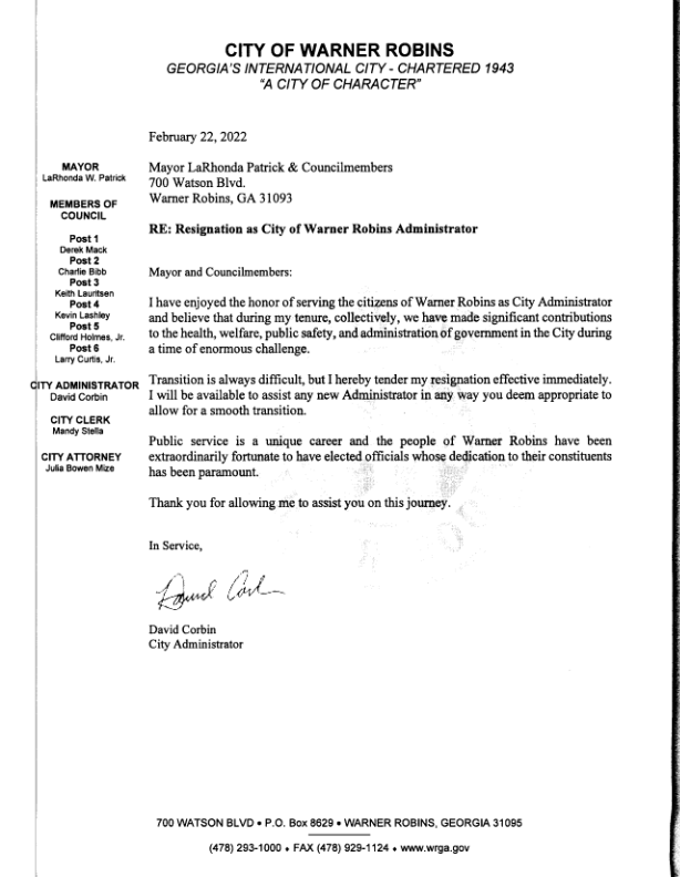 According to a Public Information Officer from the City of Warner Robins, City Administrator, David Corbin, handed in his letter of resignation on February 22nd, 2022. In the letter, Corbin says he has enjoyed his time serving the citizens of Warner Robins, and that the people of Warner Robins have been fortunate to have elected officials whose dedication to their constituents has been paramount.